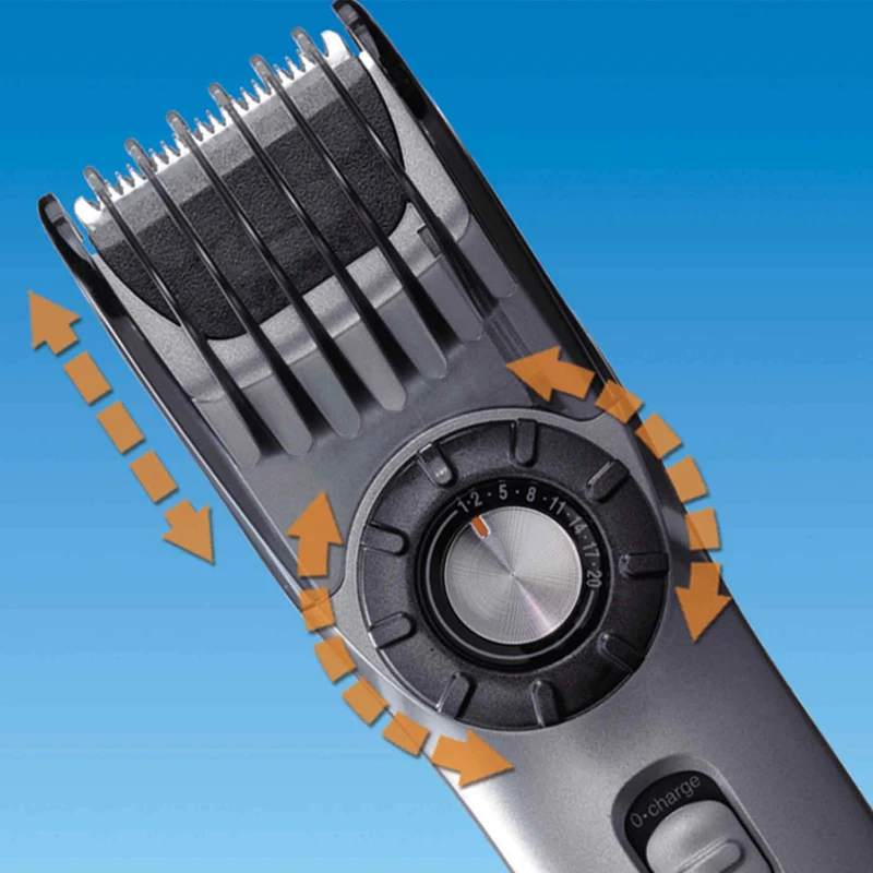 - تنظیمات دقیق طول اصلاح: ER217 مجهز به یک دایره تنظیم (Dial) است که امکان انتخاب 12 سطح مختلف از طول اصلاح را فراهم میکند. این تنظیمات از 3 میلیمتر تا 20 میلیمتر متغیر است، که این دستگاه را برای کوتاه کردن ریش در طولهای مختلف یا کوتاهی موی سر ایدهآل میسازد.